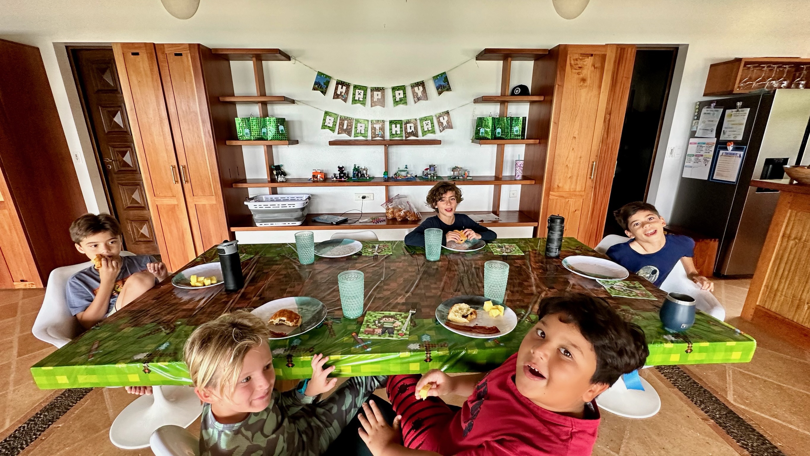 PJC’s party theme was a no brainer- his one obsession, Minecraft. He had 5 of his besties over for a sleepover. They mined real gems, hunted for oxilotils in the pool, played a Minecraft trivia game (designed and created by PJC), ate a creeper cake, and of course, played the actual game.